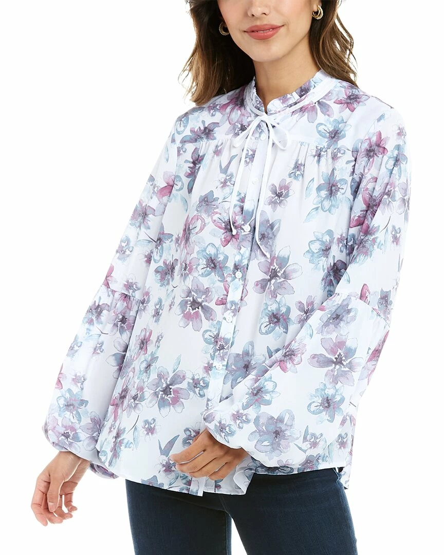 - Peasant Blouse in Waterford floral with ruffled self-tie mock collar, blouson sleeves, elasticized cuffs, and shirttail hem