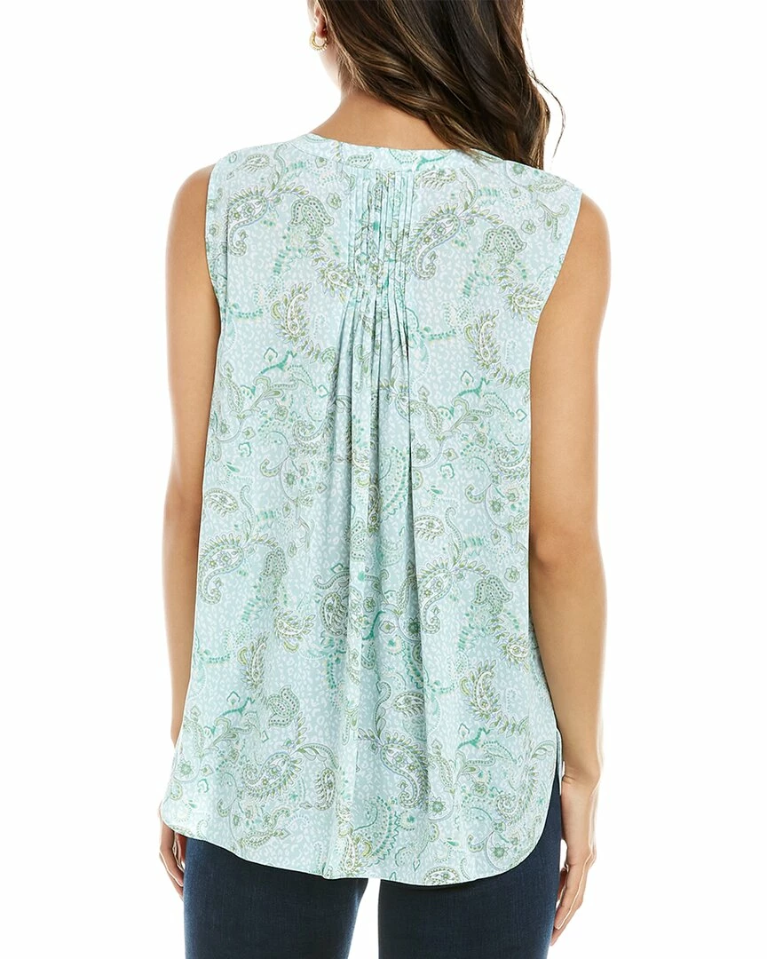 - Pintuck Blouse in stella paisley with notched neckline with mandarin collar and high-low hem